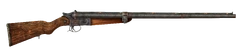 Unlike the similar sawed-off shotgun, this firearm has both its barrel and stock intact while being quite rusty and still requiring a metal strap to keep the forearm and barrels together.