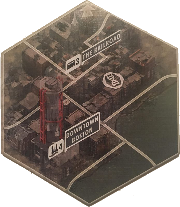 Downtown Boston appears only in Fallout: The Board Game when playing the The Commonwealth scenario. Its tile also has The Railroad settlement on it.