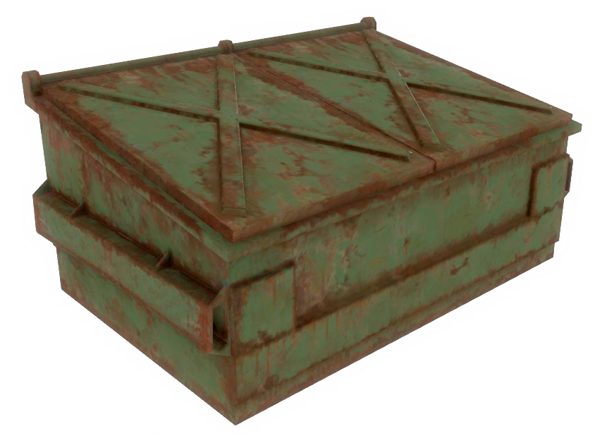 A green and rusted dumpster, used as a trash bin before the bombs dropped. They can be searched for loot, if both their lids are intact and are non-interactable if either lid is missing.