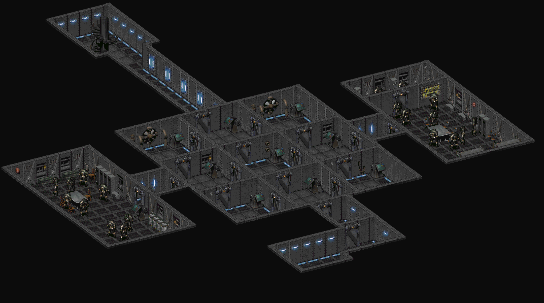 The center of the Oil Rig Access Corridor is occupied by nine small rooms in a 3x3 grid with locked (and trapped) doors between them. Each room has a computer console in it that opens some doors and closes others. This array of rooms was used heavily by the Enclave for hazing its members.[Non-game 1]