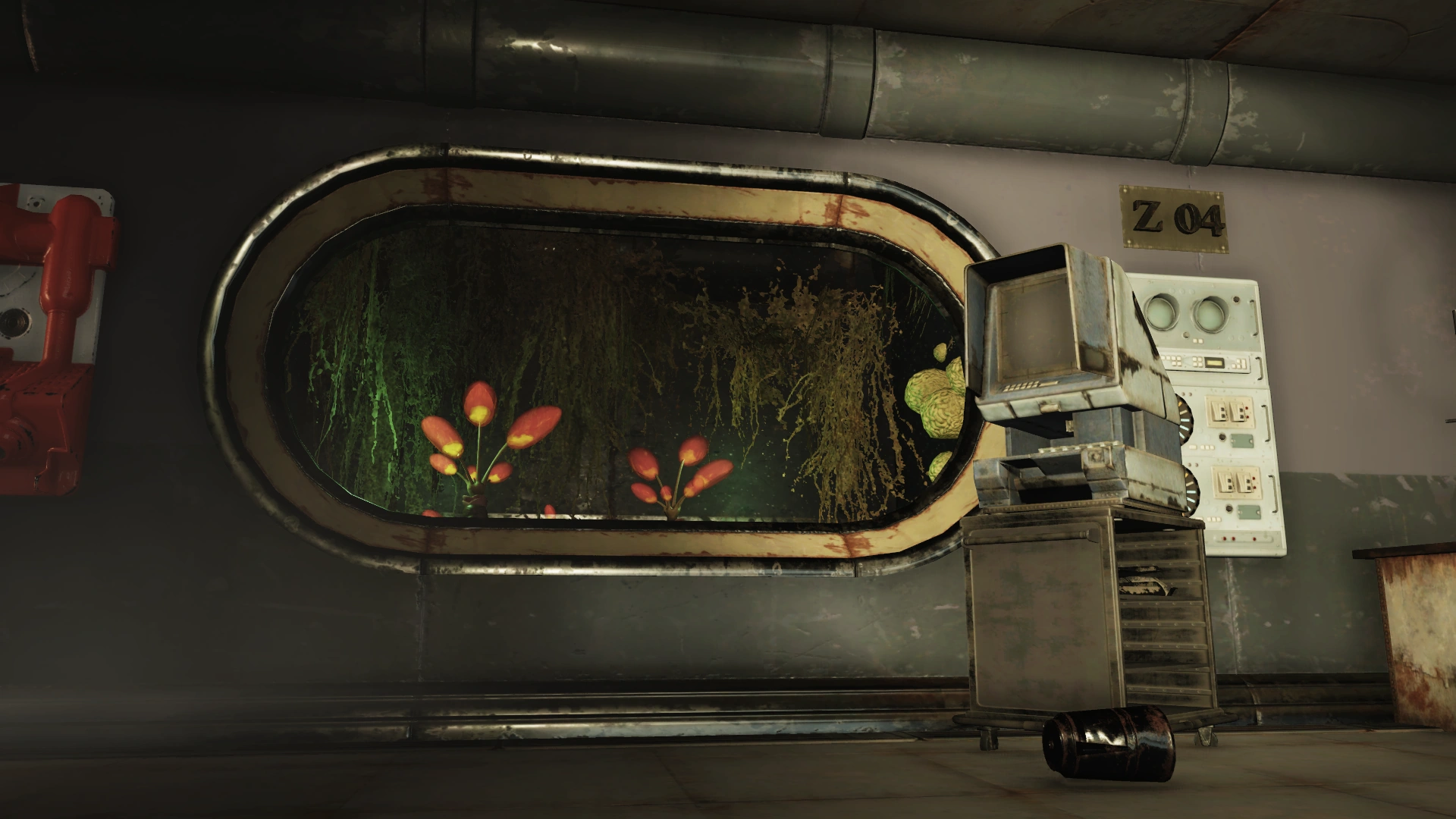 There is a lab console terminal and a door on the eastern end (Picklock 0) leading back to the room with the noxious gas. In this area, holding cells can be found that are labeled Z01, Z04, and Z05. A destroyed holding cell labeled Z01 has several Mothman eggs, and a southern door marked "EXIT" that leads to a room with holding cells Z04 and Z05. Several alien corpses are located in the inaccessible Z05 and plants such as kaleidopore are seen behind a windowed cell labeled Z04. A buffer room thereafter leads back to cell block A.
