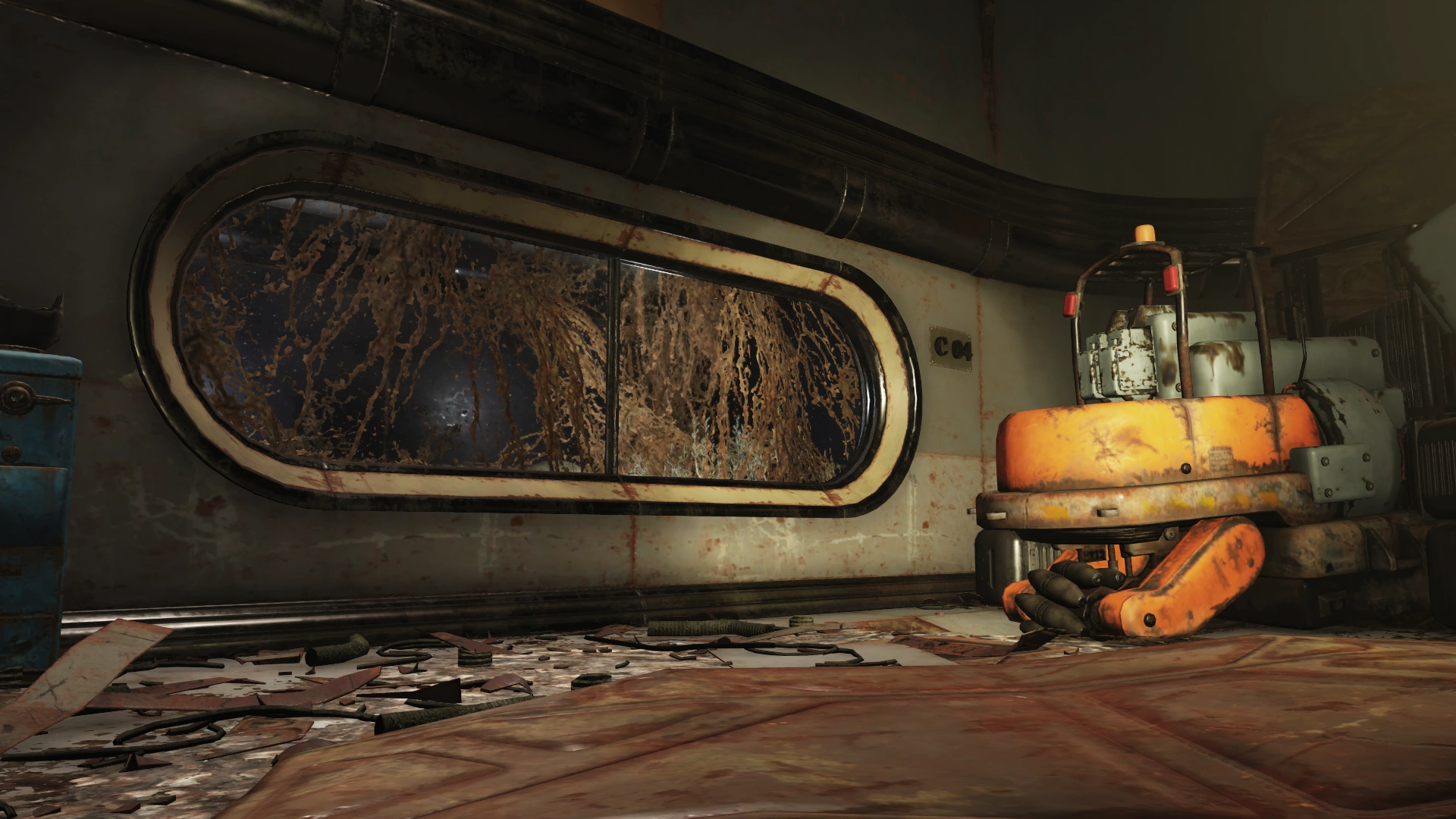 In the center is a table with a dead radscorpion. A chemistry station and power armor station can be utilized here as well. The staircase at the end of the room leads to a door that requires the holding cell keycard, which can be found on a nearby Enclave corpse. This leads to a small office area with the cell block C console terminal, as well as several junk items and containers to loot.