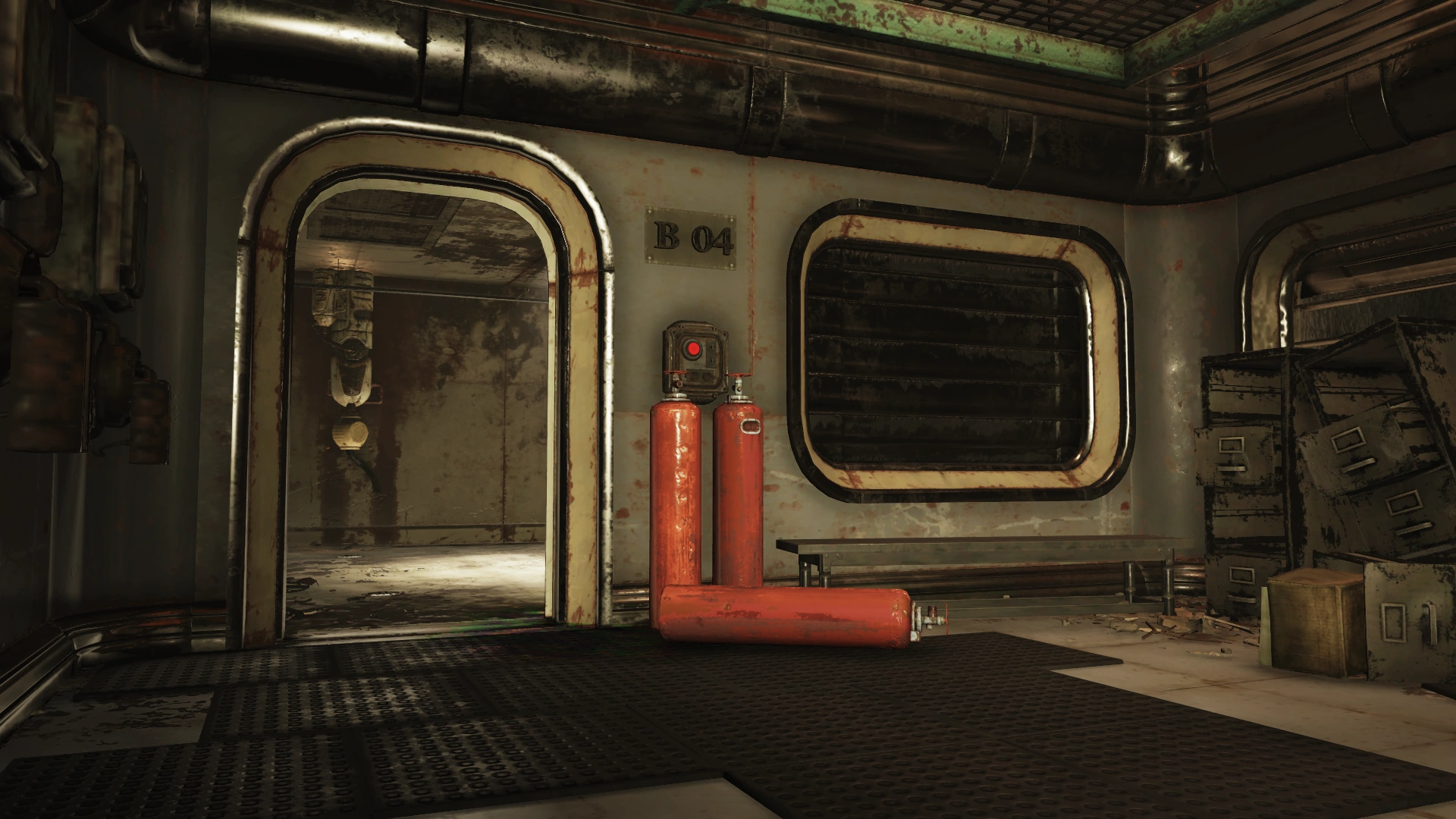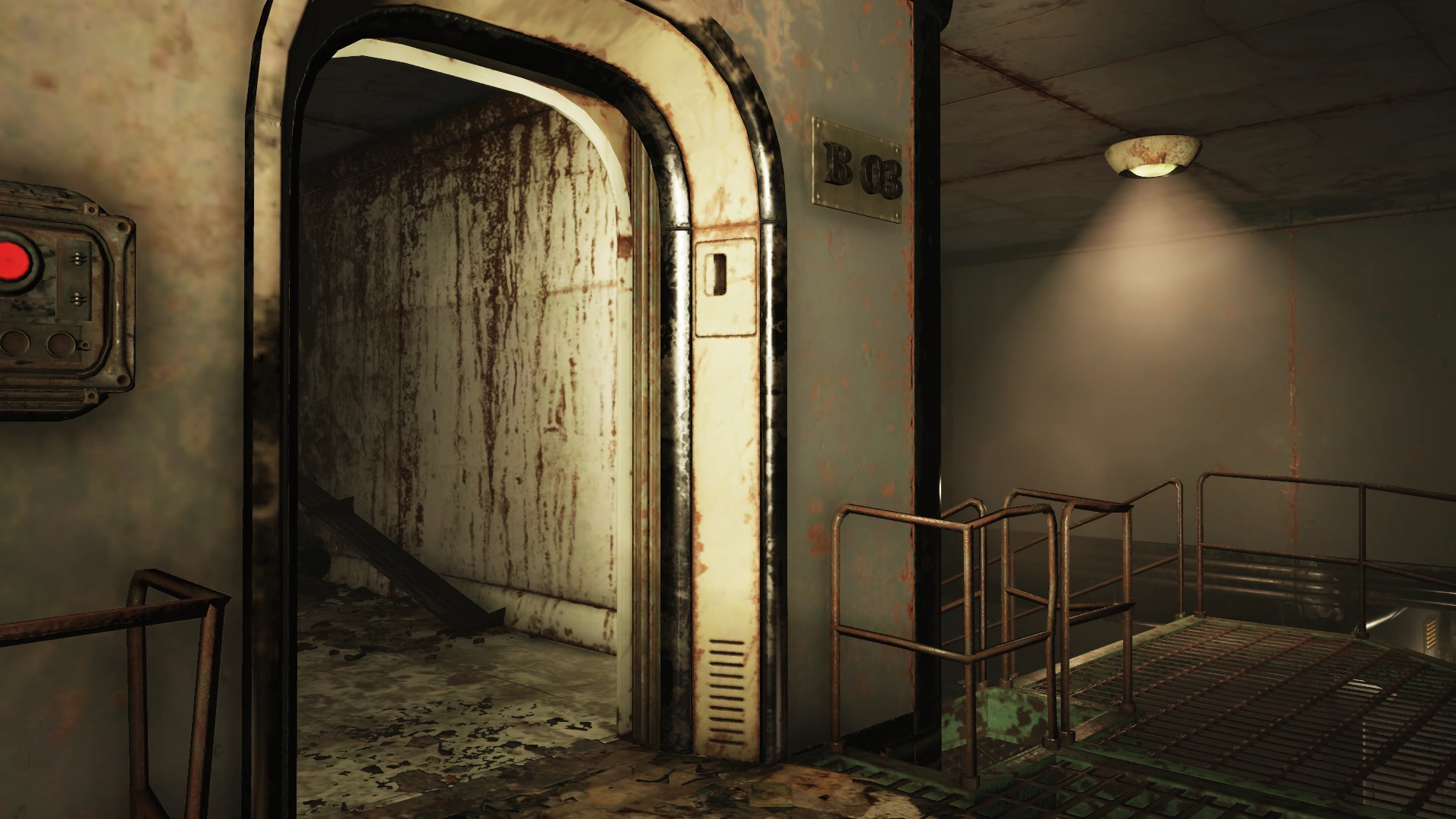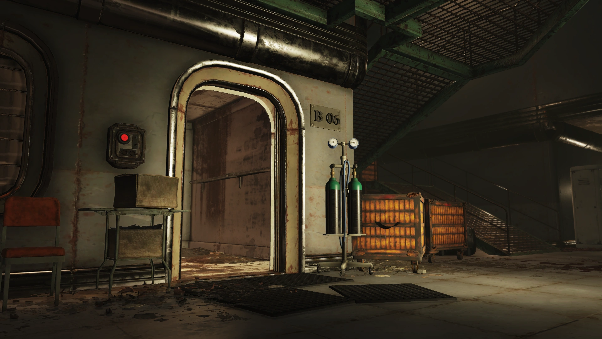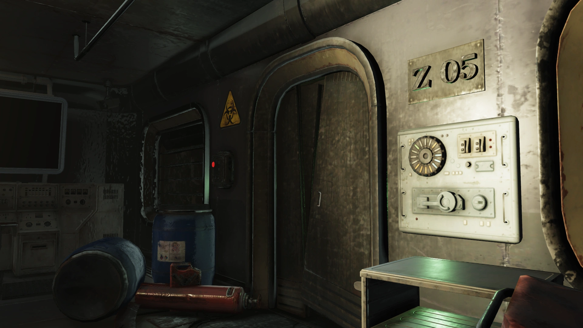 To the left are two doors and a decontamination hallway; the door with the handprint scanner requires the aforementioned administrative access, while the other leads to an observation room for the decontamination hallway. The arches themselves irradiate rather than curing it. Both sides of the observation room have locked doors (Picklock 0). Several split-flap displays are still operational, providing information on the surrounding area and status of the holding cells. These status updates will change based on progression through the facility and associated quests.