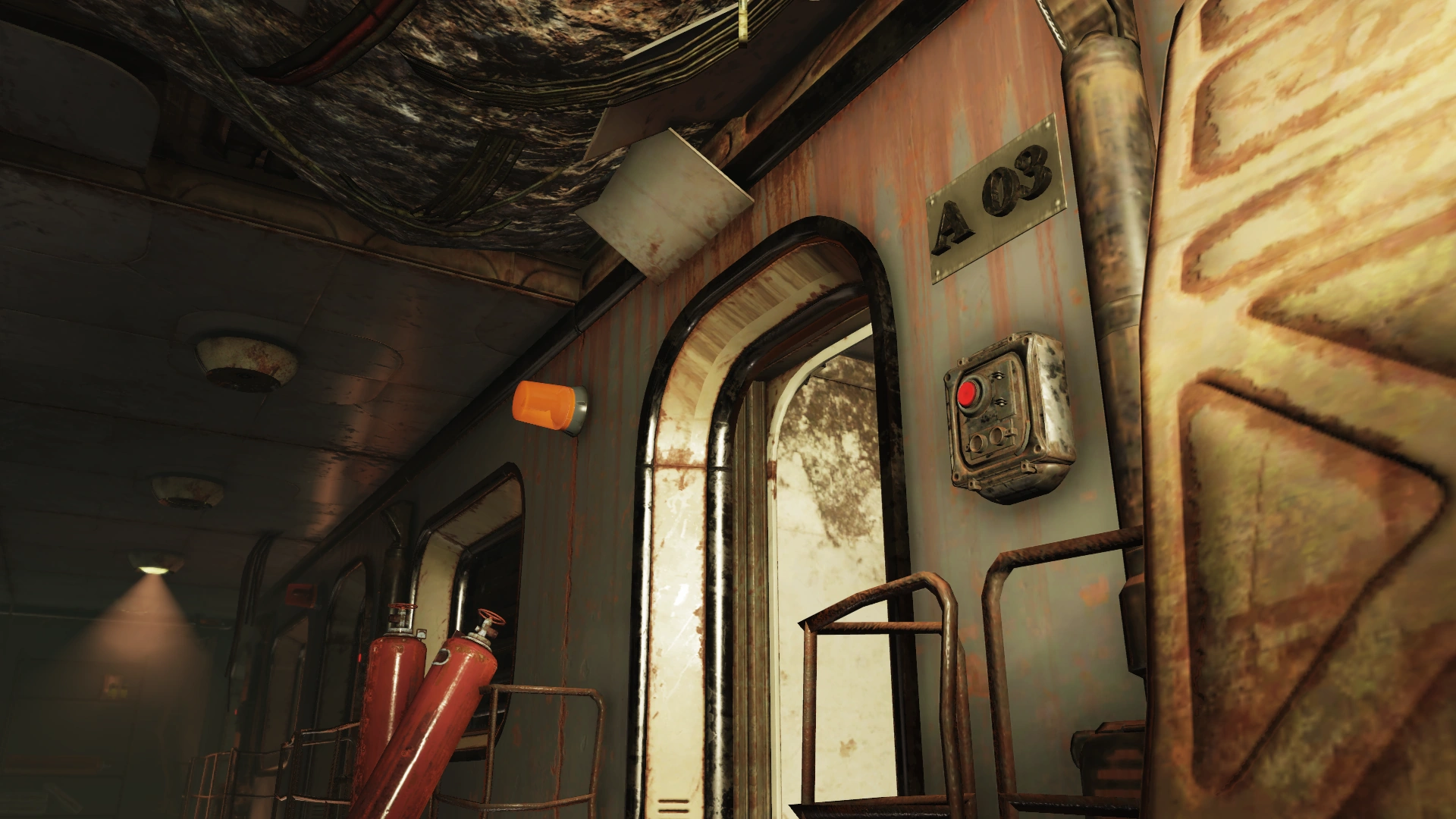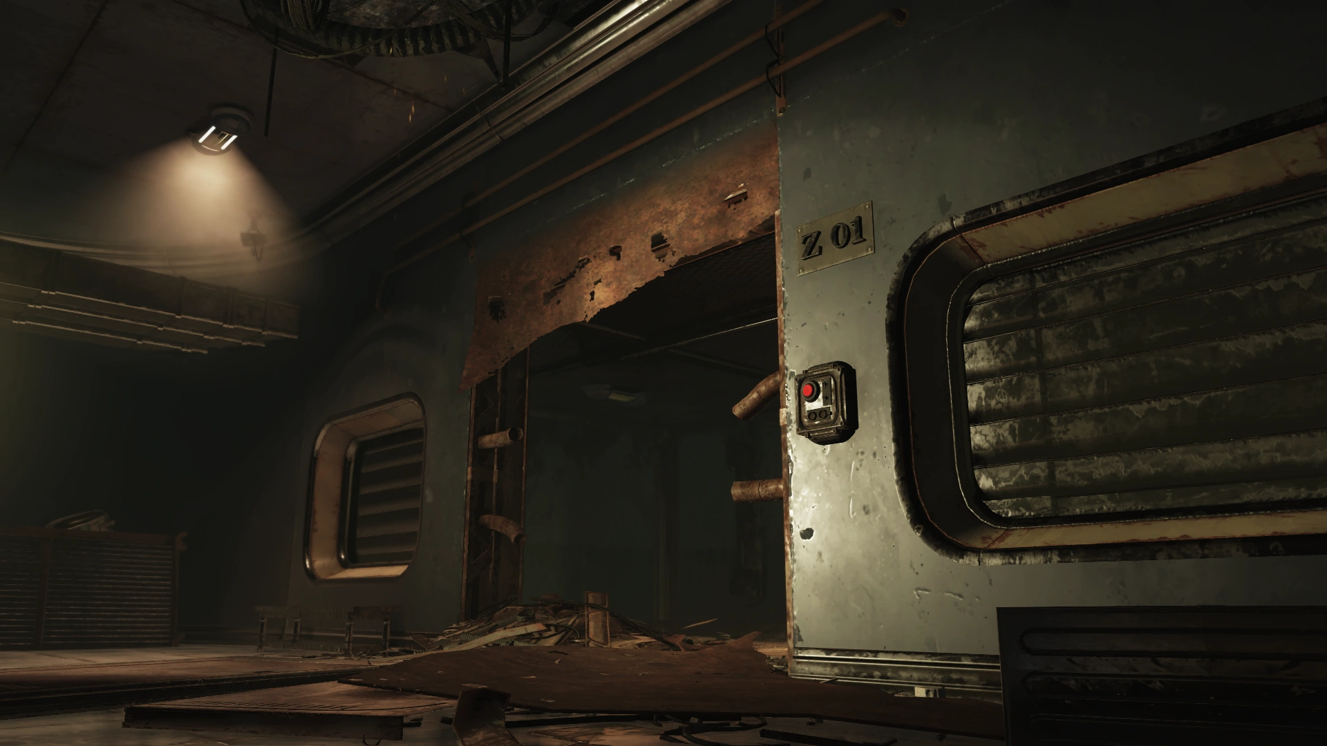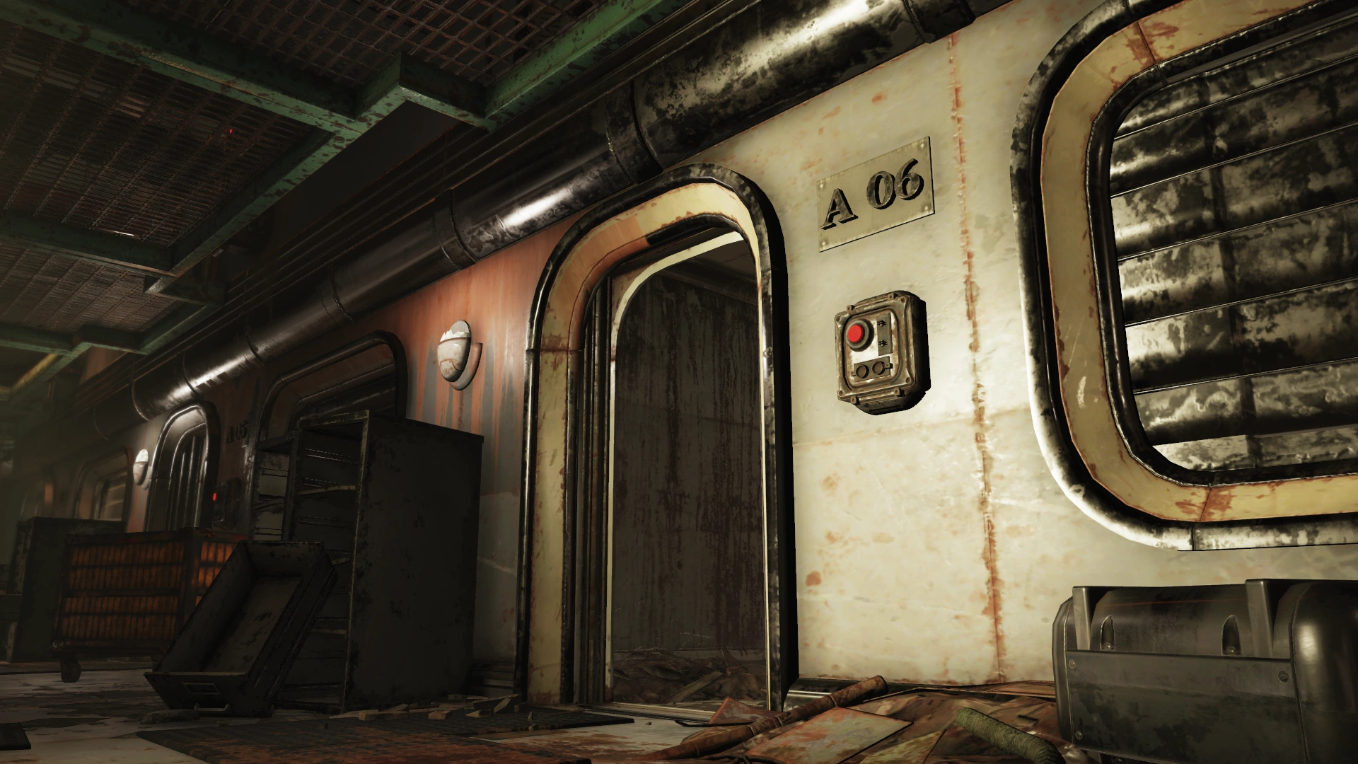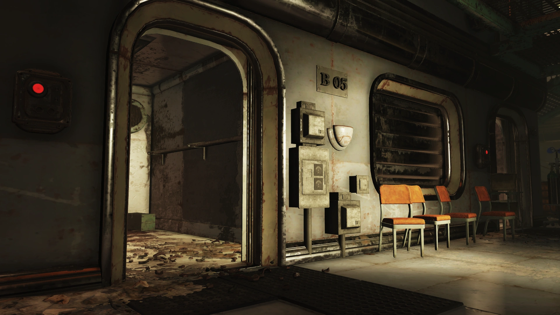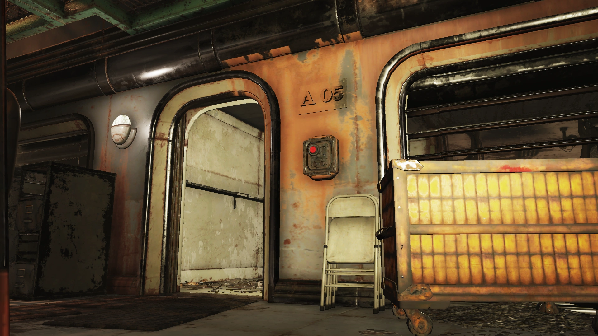 To the left are two doors and a decontamination hallway; the door with the handprint scanner requires the aforementioned administrative access, while the other leads to an observation room for the decontamination hallway. The arches themselves irradiate rather than curing it. Both sides of the observation room have locked doors (Picklock 0). Several split-flap displays are still operational, providing information on the surrounding area and status of the holding cells. These status updates will change based on progression through the facility and associated quests.