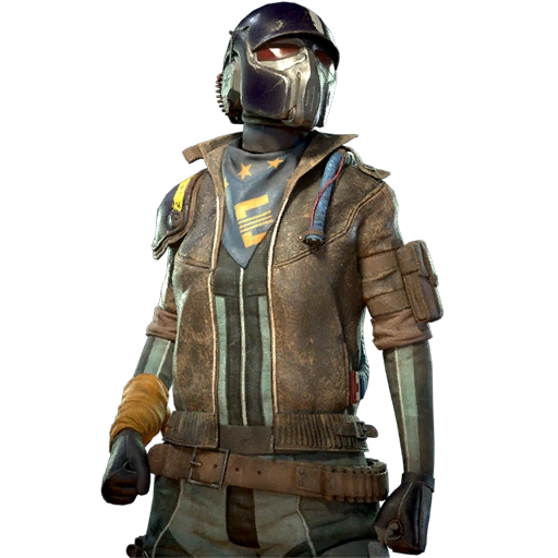 A set of zipped-up mechanic fatigues, worn with a blue Enclave bandana around the neck and a customized leather coat. The outfit has been further modified with improvised armor on the right shoulder, knees, and left thigh, painted in navy blue markings with a yellow high visibility stripe, except for the thigh armor.