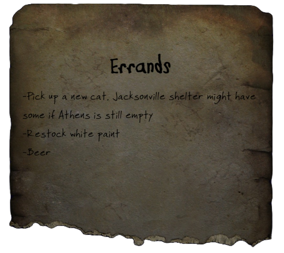 -Pick up a new cat. Jacksonville shelter might have some if Athens is still empty