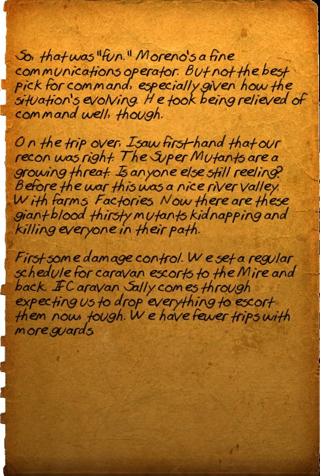 On the trip over, I saw firsthand that our recon was right. The Super Mutants are a growing threat. Is anyone else still reeling? Before the war this was a nice river valley. With farms. Factories. Now there are these giant blood thirsty mutants kidnapping and killing everyone in their path.
