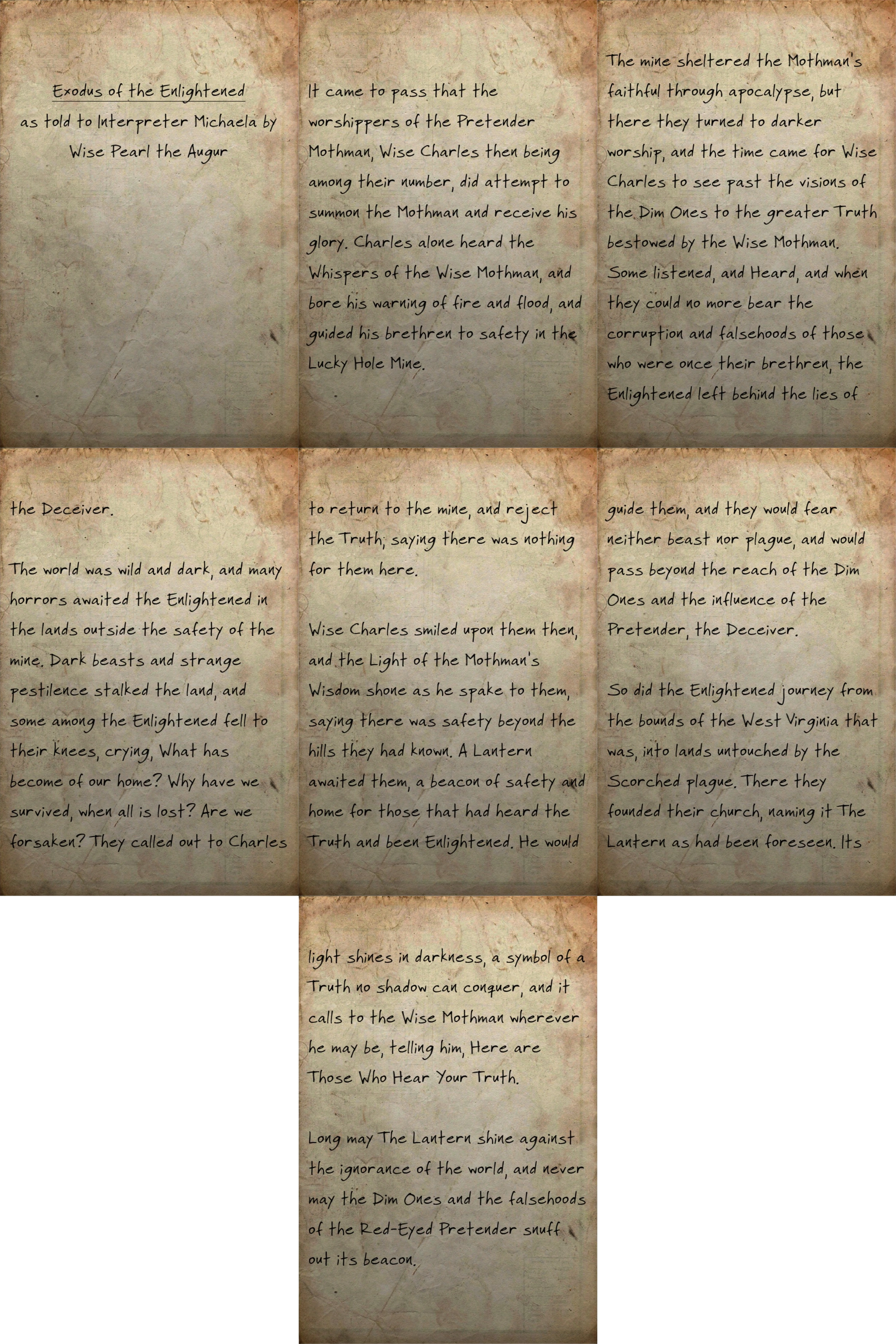 So did the Enlightened journey from the bounds of the West Virginia that was, into lands untouched by the Scorched plague. There they founded their church, naming it The Lantern as had been foreseen. Its light shines in darkness, a symbol of a Truth no shadow can conquer, and it calls to the Wise Mothman wherever he may be, telling him, Here are Those Who Hear Your Truth.