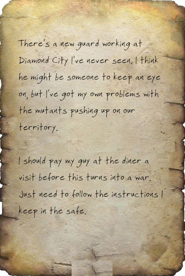 There's a new guard working at Diamond City I've never seen. I think he might be someone to keep an eye on, but I've got my own problems with the mutants pushing up on our territory.