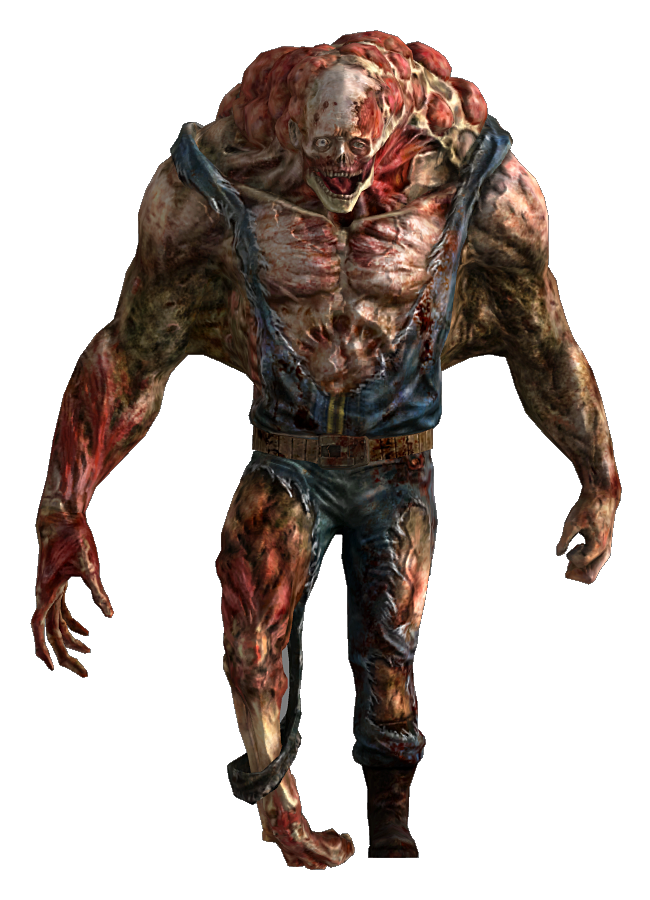 Failed FEV subjects appear to have undergone much of the same physical changes that other super mutants went through after FEV exposure, such as greenish skin and increased muscle mass and bone density. However, their internal structures seem to have grown at a random, rapid pace throughout their body, resulting in the muscles and bones bursting the skin, killing them in a horrific and painful fashion. The failed FEV subjects' upper torsos are much larger and far more visibly mutated than their legs, with enormous tumor-like growths blooming from the neck and shoulders. They all wear tattered Vault 87 jumpsuits.