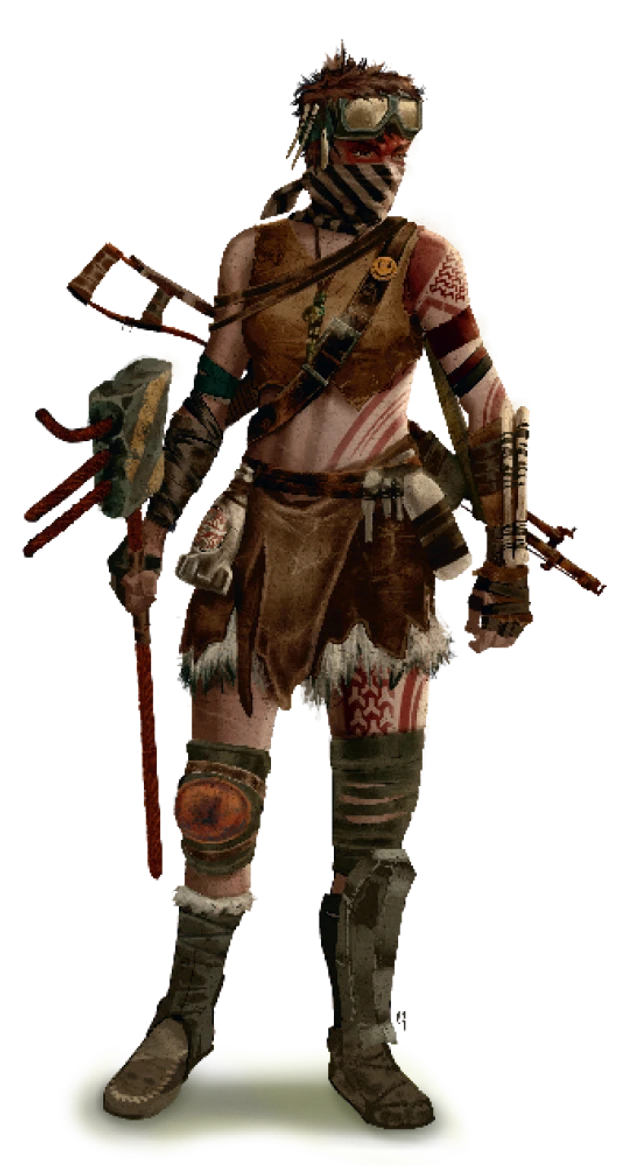 - Cult of the Mothman: The tribal followers of the cryptid “Mothman” in Appalachia have technically existed in various forms even before the Great War as cultists that worship the mythical Mothman that is said to inhabit the forest of Appalachia, West Virginia. Its followers tend to use weapons constructed of bone, wood, or metal scraps, and augment their scrappy clothing with skeletal ornaments. The followers more closely resemble cult-like devotees than a functional society.