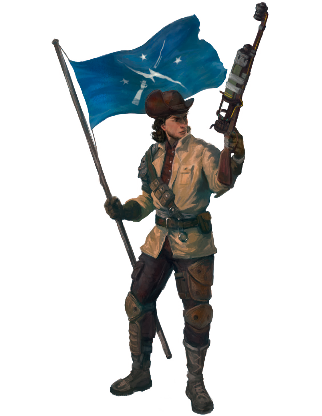 - Either a Hunting Rifle with 6 + 4 CD .308 Rounds, a Black Powder Blunderbuss with 6 + 4 DC .50 Balls, or a Pipe Gun and Pipe Revolver with 4 + 6 DC .38 and 4 + 6 DC .45 Rounds.
