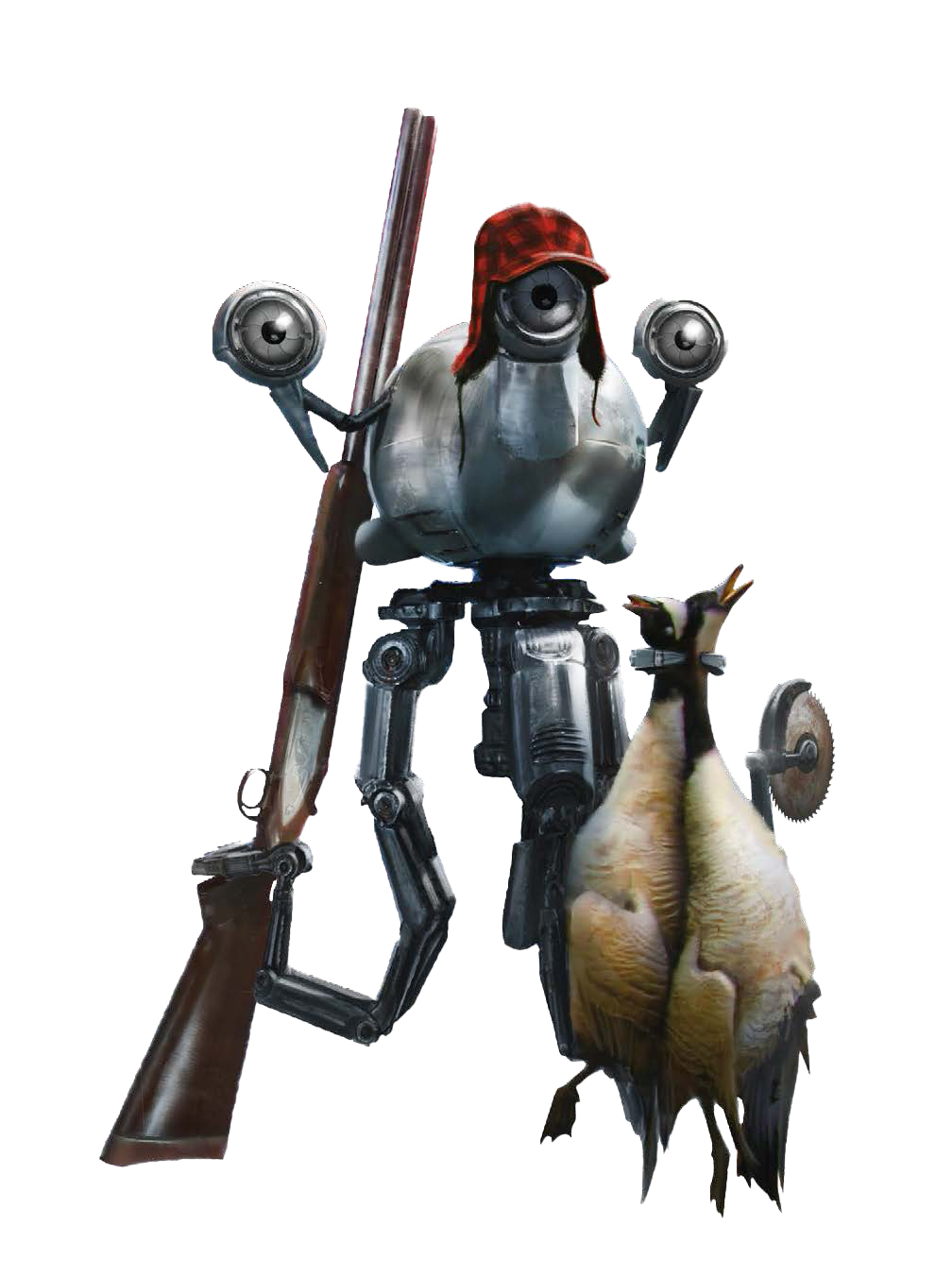- A printer (housed inside the torso) that can receive broadcasts and print leaflets in black ink