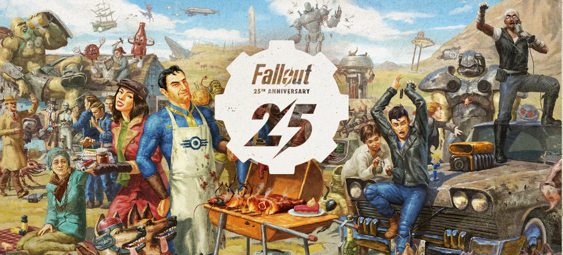 A unique piece of keyart was created for the Fallout 25th Anniversary, seen at the top of this page and in the gallery. A number of characters from across every Fallout game are pictured in various poses: