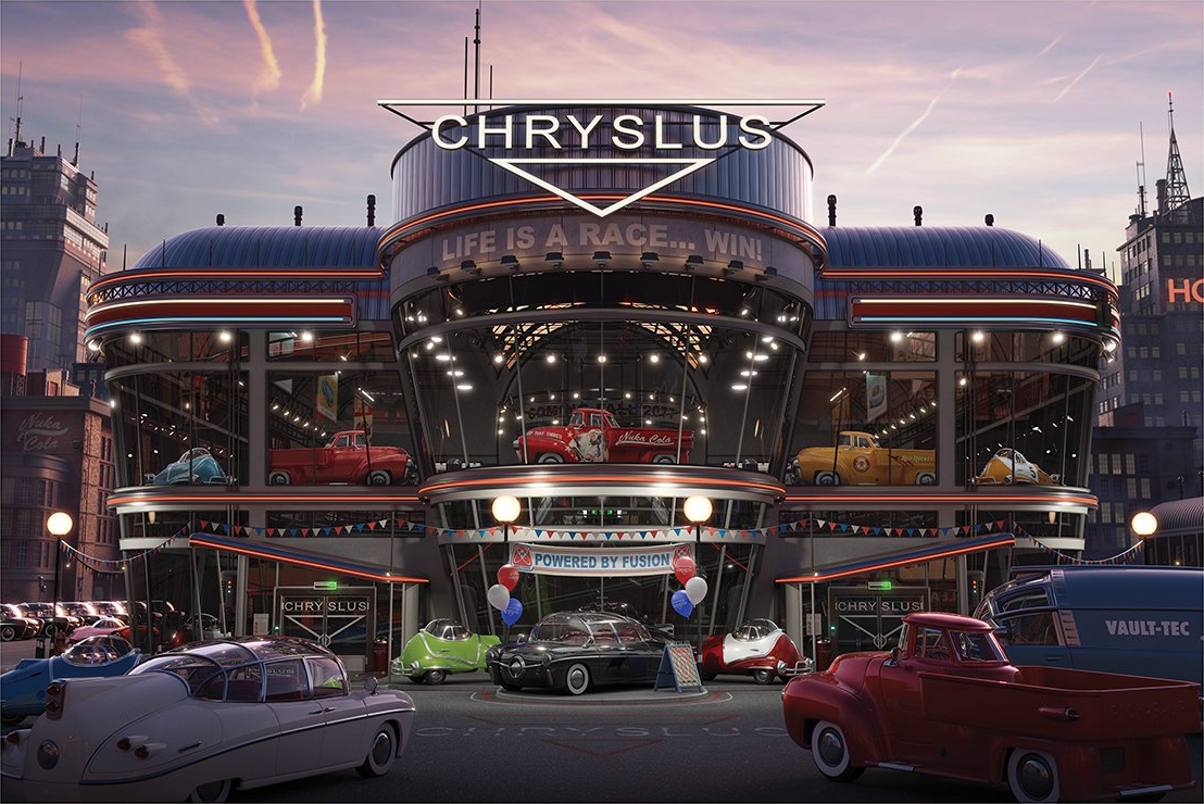Limited individually numbered edition of 300 Dusk and 100 Night prints were available of this lithograph depicting a Chryslus dealership.