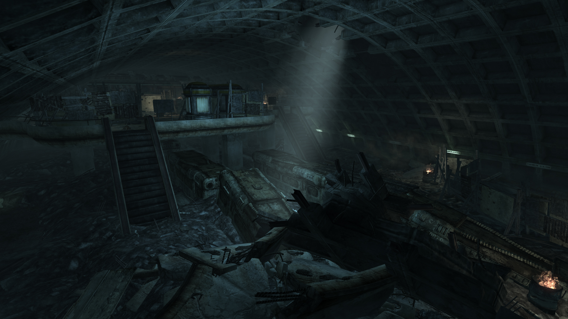 Much later, a gang of raiders constructed a camp on the mezzanine. Feral ghouls moved in seeking shelter. Both factions now compete over the mezzanine and platform.