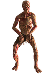 Not all endless walkers end up radscorpion food, at least not at first. On those rare occasions when one survives more than one year in the wasteland, they turn into wandering, voracious creatures on an endless quest for flesh. Due to their prolonged, open exposure to the scorching desert sun, high radiation and other hardships of the wasteland, these ghouls, who were banished naked from the Reservation, look like walking, sun-bleached chunks of beef jerky. Their constant exposure to the hot sun and high levels of radiation has caused their skin to toughen into natural, hardened leather, but at the same time, their ability to reason has been completely lost.