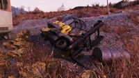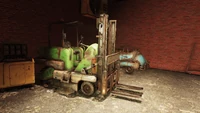 Found at loading docks or in industrial areas, the forklift contains one seat, with a steering wheel and controls, under an open roll cage. Variants are painted orange, green, white, red, and yellow, with the faded max load capacity on the side near the driver's seat. There are 282 forklifts in Appalachia. This includes color variants in the amounts of 134 orange, 64 yellow, 36 red, 9 white, and 39 green.