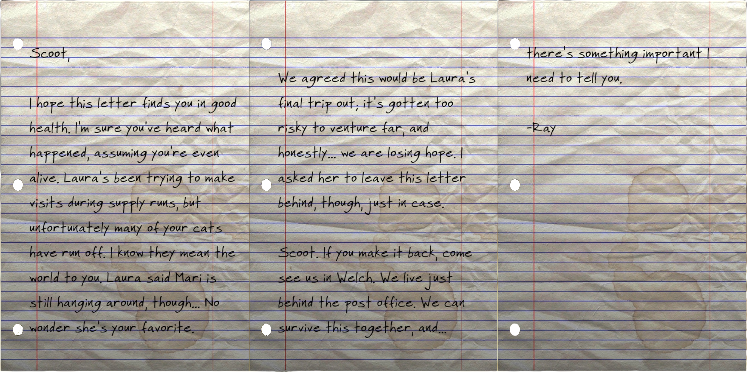 We agreed this would be Laura's final trip out; it's gotten too risky to venture far, and honestly... we are losing hope. I asked her to leave this letter behind, though, just in case.