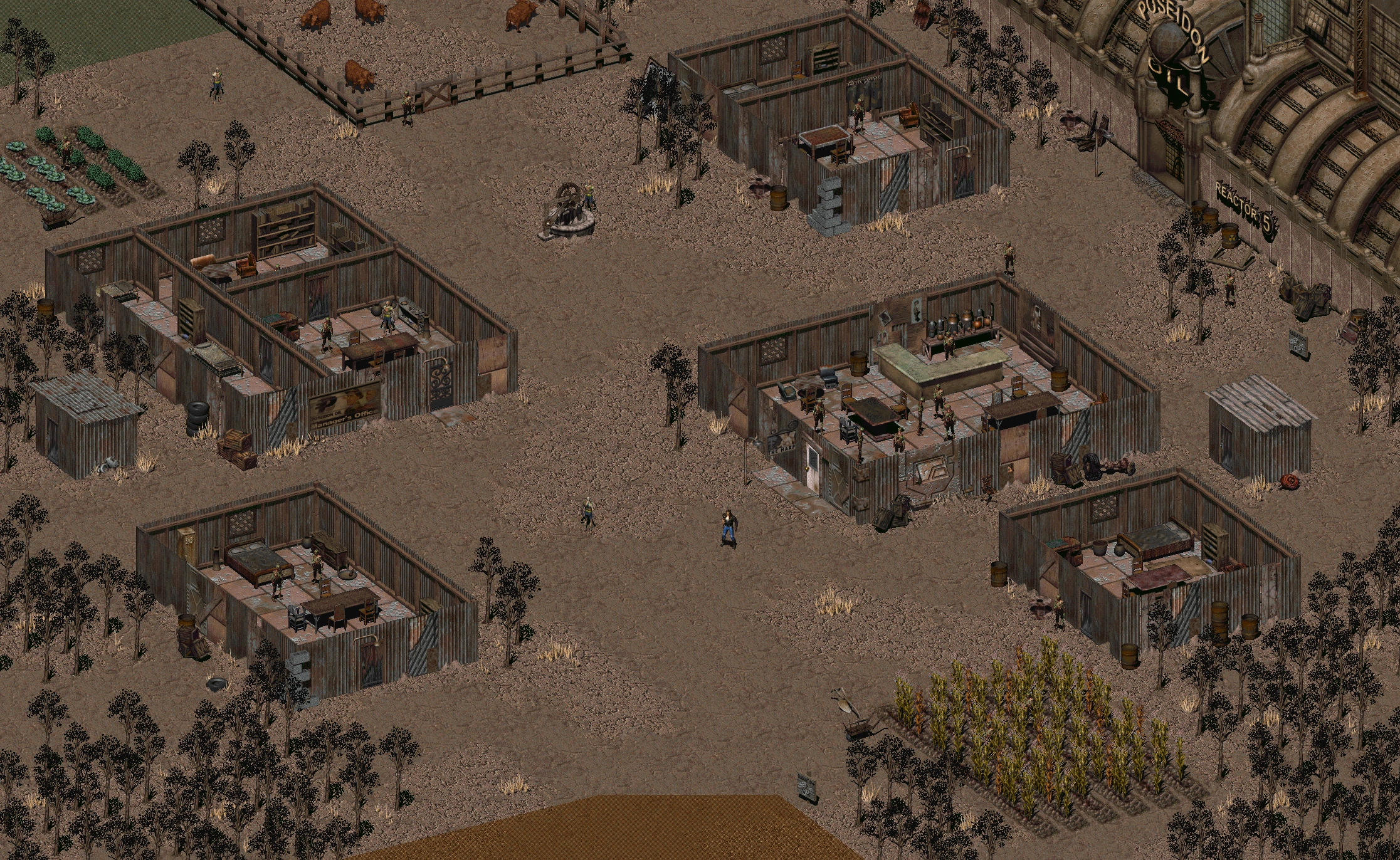 It is a large, open square with homes with the administration building and the Harp bar ringing it. The town well is close to the entrance of the reactor. It gives access to the junkyard near the brahmin pens and the main reactor doors.