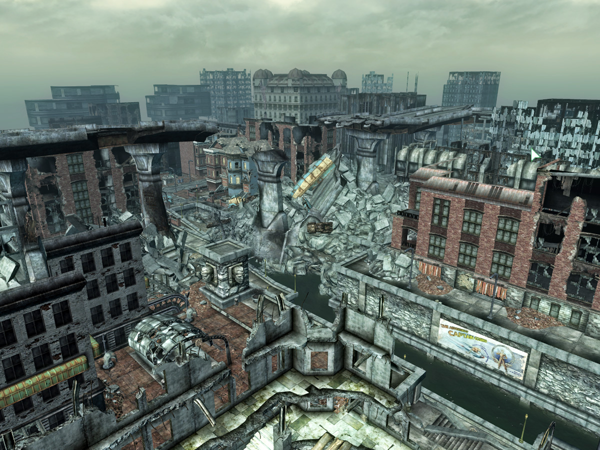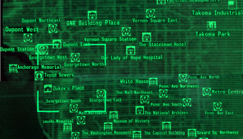 The research for the Wasteland Survival Guide leads the Lone Wanderer to this location, which is accessible at any time via the metro stations. Emerging from the tepid sewers to the north are some small shops including Cornucopia Fresh Groceries and Radiation King. It is common to find both Talon Company mercs and super mutants in the area. Moving south and to the west, one will encounter the McClellan family's townhome. At the southernmost point of the map, there is the La Maison Beauregard building, as well as access to both the Penn Ave Georgetown Metro and metro access to the Mall.