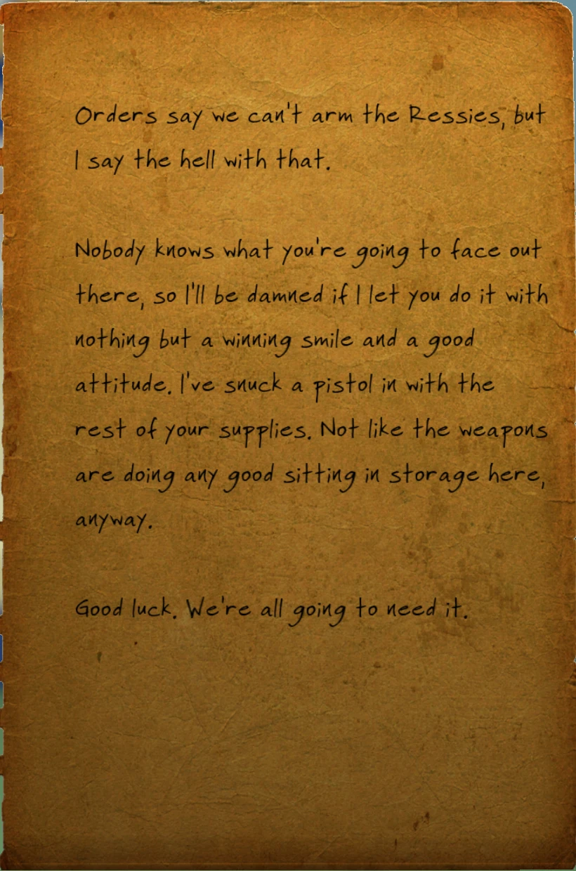 Nobody knows what you're going to face out there, so I'll be damned if I let you do it with nothing but a winning smile and a good attitude. I've snuck a pistol in with the rest of your supplies. Not like the weapons are doing any good sitting in storage here, anyway.