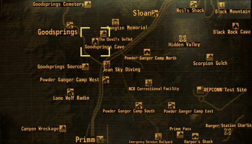 The Goodsprings cave is a location within Goodsprings in the Mojave Wasteland in Fallout: New Vegas.
