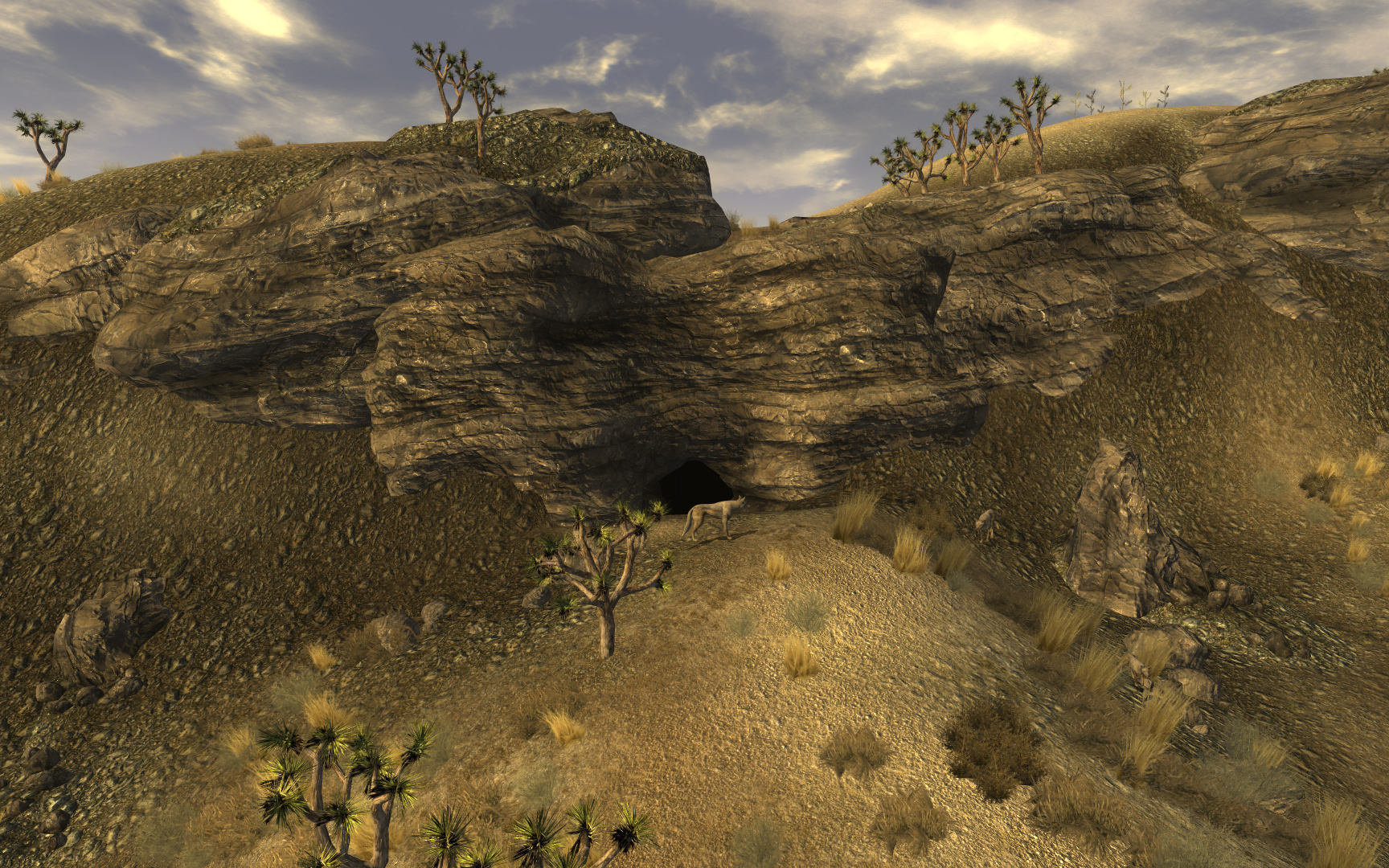 Situated southeast of Goodsprings, the cave is home to a pack of four coyotes and two pups. If they are killed, as many as four radscorpions of varying size may later be found lurking around the entrance. To the right of the cave entrance, there is a hollowed-out rock. It is the upright one a couple of feet away from the mountain face.