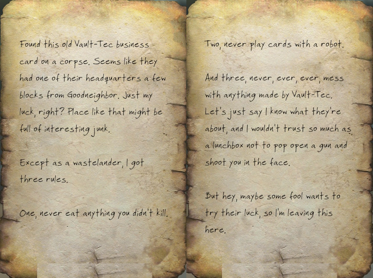 Found this old Vault-Tec business card on a corpse. Seems like they had one of their headquarters a few blocks from Goodneighbor. Just my luck, right? Place like that might be full of interesting junk.