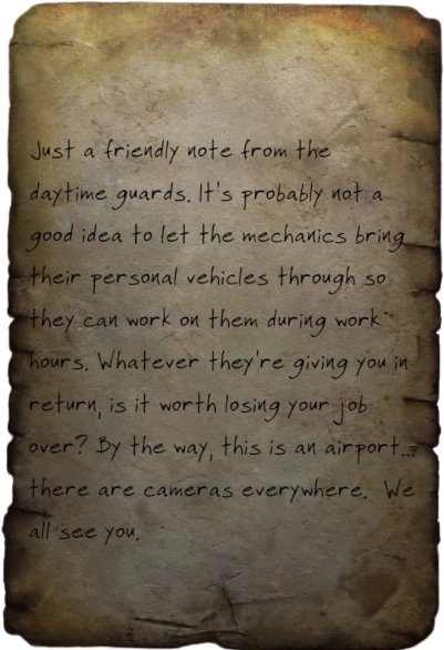 Just a friendly note from the daytime guards. It's probably not a good idea to let the mechanics bring their personal vehicles through so they can work on them during work hours. Whatever they're giving you in return, is it worth losing your job over? By the way, this is an airport... there are cameras everywhere. We all see you.