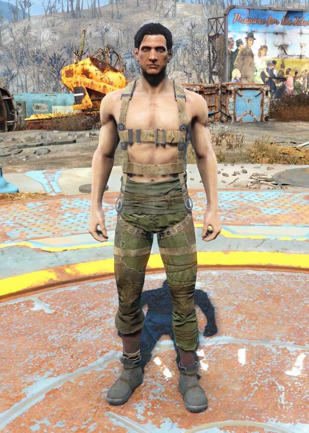 Outfits Army fatigues (dirty) · Athletic outfit · Baseball uniform · Bathrobe · Beaded blazer · Black vest and slacks · Bomber jacket · Brotherhood fatigues · BOS uniform · Casual outfit · Checkered shirt and slacks · Child of Atom rags (long, long brown, long green, short, short brown, short green, simple, brown, green) · Cleanroom suit · Colonial duster · Corset · Courser uniform · Drifter outfit · Engineer's armor (Teagan's armor ) · Explorer outfit (Scavenger ) · Farmhand clothes · Fatigues · Feathered dress · Field scribe's armor · Flannel shirt and jeans · Geneva's ensemble · Greaser jacket and jeans (Atom Cats , Zeke's ) · Green shirt and combat boots · Grognak costume · Gunner flannel shirt and jeans · Gunner guard outfit · Gunner harness · Harness · Hazmat suit (damaged) · Hooded rags · Ingram's UnderArmor · Institute division head coat (black, blue, green, orange, yellow, dirty black, dirty blue, dirty green, dirty orange, dirty yellow) · Institute jumper (dirty) · Institute lab coat (black, blue, green, orange, yellow, dirty black, dirty blue, dirty green, dirty orange, dirty yellow) · Kellogg's outfit · Lab coat (Cabot's , Father's , Vault-Tec ) · Laundered dress (blue , cream , denim , green , rose , pink ) · Laundered loungewear · Leather coat (Traveling leather coat ) · Letterman's jacket and jeans (DB Tech varsity uniform ) · Long johns · Longshoreman outfit · MacCready's duster · Maxson's battlecoat · Mechanic jumpsuit (green, Red Rocket) · Military fatigues · Minuteman outfit · Minutemen general's uniform · Padded blue jacket · Pastor's vestments · Postman uniform (dirty) · Quinlan's armor · Radstag hide outfit · Raider leathers · Railroad armored coat · Ratty skirt · Red dress · Red frock coat · Red leather trench coat · Road leathers · Science scribe's armor · Sequin dress (Agatha's dress ) · Silver Shroud costume · Submariner uniform · Suit (black , blue , striped , tan , grey , patched , patched three-piece , Lorenzo's ) · Summer shorts · Surveyor outfit (Reginald's suit ) · Suspenders and slacks · Sweater vest and slacks (Covert sweater vest ) · Synth uniform · Tattered field jacket · Tattered rags · T-shirt and slacks · Tuxedo · Undershirt & jeans · Utility coveralls · Vault jumpsuit · Winter jacket and jeans · Yellow trench coat (dirty , faded )