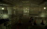 Inside on the right there is a bedroom with a bed and chest at the foot of the bed, a kitchen with some empty cabinets, and a bathroom. The part of the house where Haley does business with the people of Point Lookout has a counter and a locker holding Haley's inventory and requires a key. There is also a workbench that can be used to the left of the bathroom. A bottlecap mine on the bench can be stolen, which results in negative Karma. There is also an Average locked safe containing various loot.