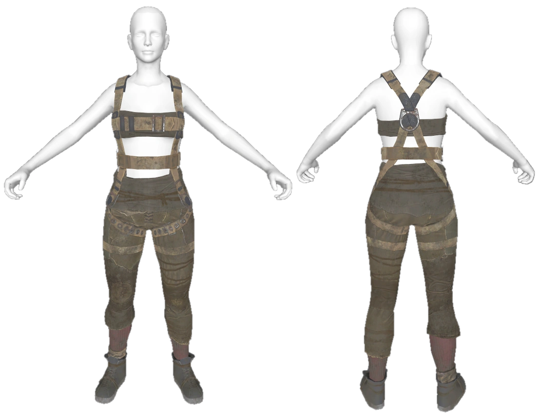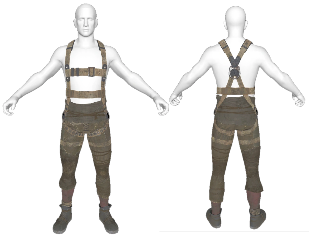 The harness is a piece of lightweight armor. It is a worker's harness worn over pants with a pair of boots. It is worn with no shirt underneath and is classified as underarmor, meaning armor pieces can be worn over it.