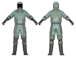 Visually, it is a completely different design from the conventional orange hazmat suit. Instead of a large, bulbous helmet, it has an enclosed hood with a clear visor. It bears a large radiation symbol on the back, and, as the name suggests, the outfit is a bright teal color. As with other hazmat suits, it provides no Damage Resistance or Energy Resistance but provides 1,000 Radiation Resistance and a hidden 98% radiation damage reduction bonus.