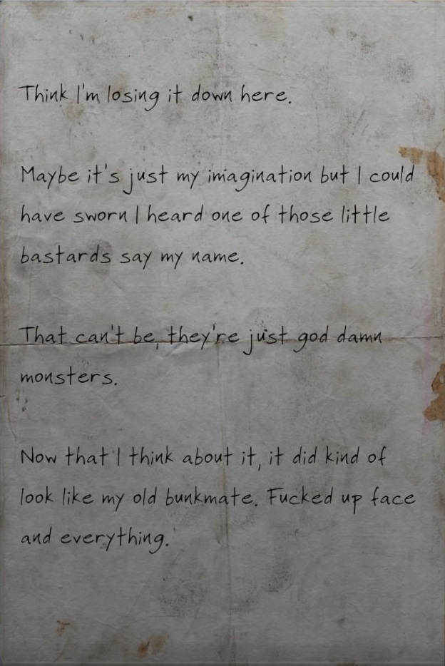 The note can be found on a barrel in The Sanctum's sewer section in The Pitt, during From Ashes to Fire. It is in the room with the large Tesla arc trap.