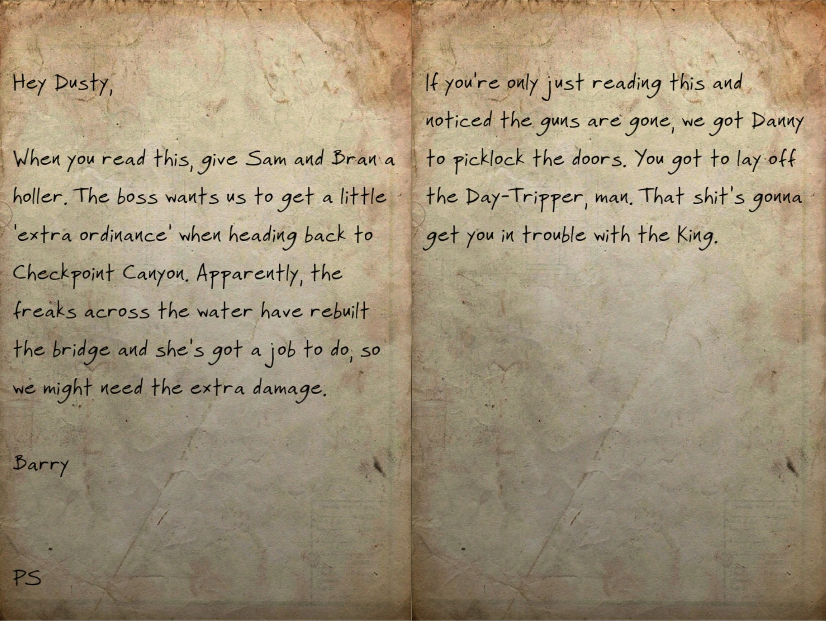 When you read this, give Sam and Bran a holler. The boss wants us to get a little 'extra ordinance' when heading back to Checkpoint Canyon. Apparently, the freaks across the water have rebuilt the bridge and she's got a job to do, so we might need the extra damage.
