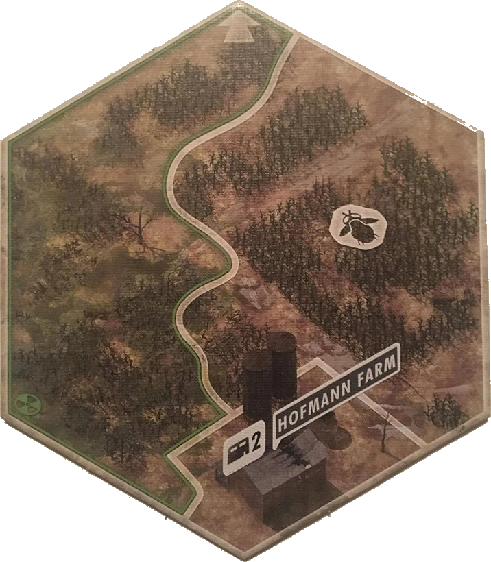 The Hofmann Farm tile has three spaces within it. The western space is radioactive, the eastern space spawns critters, and the southern space holds the level two settlement.
