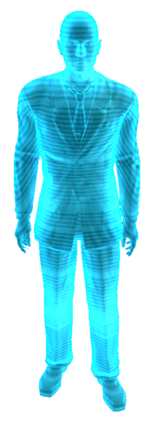 Sierra Madre holograms, as projections, rather than actual physical entities, are invulnerable to damage. They are divided into two distinct groups: Service and security holograms, all modeled after actual Sierra Madre personnel.[10] The former are simple utility projections, providing the automated systems of the Villa and the casino (such as vending points or casino games) with a user-friendly interface. These are non-hostile and are not equipped with an EBE device. In case of an emergency, the service holograms are disabled and replaced with security variants.[11]