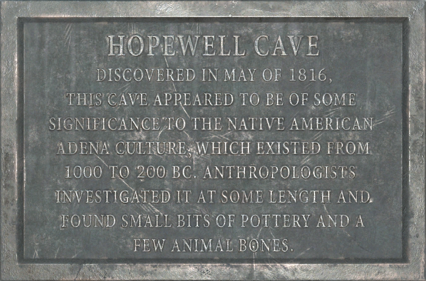 Hopewell Cave was discovered in May 1816. It played some sort of role in the Native American Adena culture, which existed from 1000-200 B.C. One anthropologist speculated that another culture moved the remains of the Adena people to this cave as a form of reverence for them, an unusual practice. He came to this conclusion because of the presence of tools too advanced for the time period in which the Adena were present.[1]