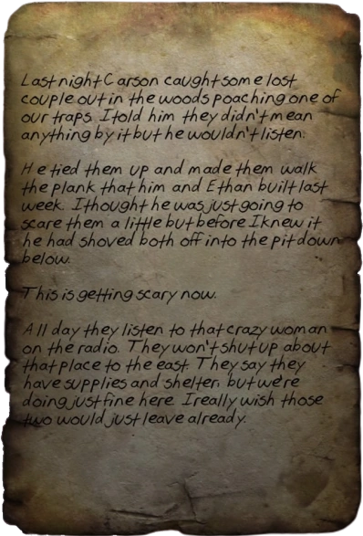 The note can be found in the southwest treehouse of the Hunter's Ridge camp.