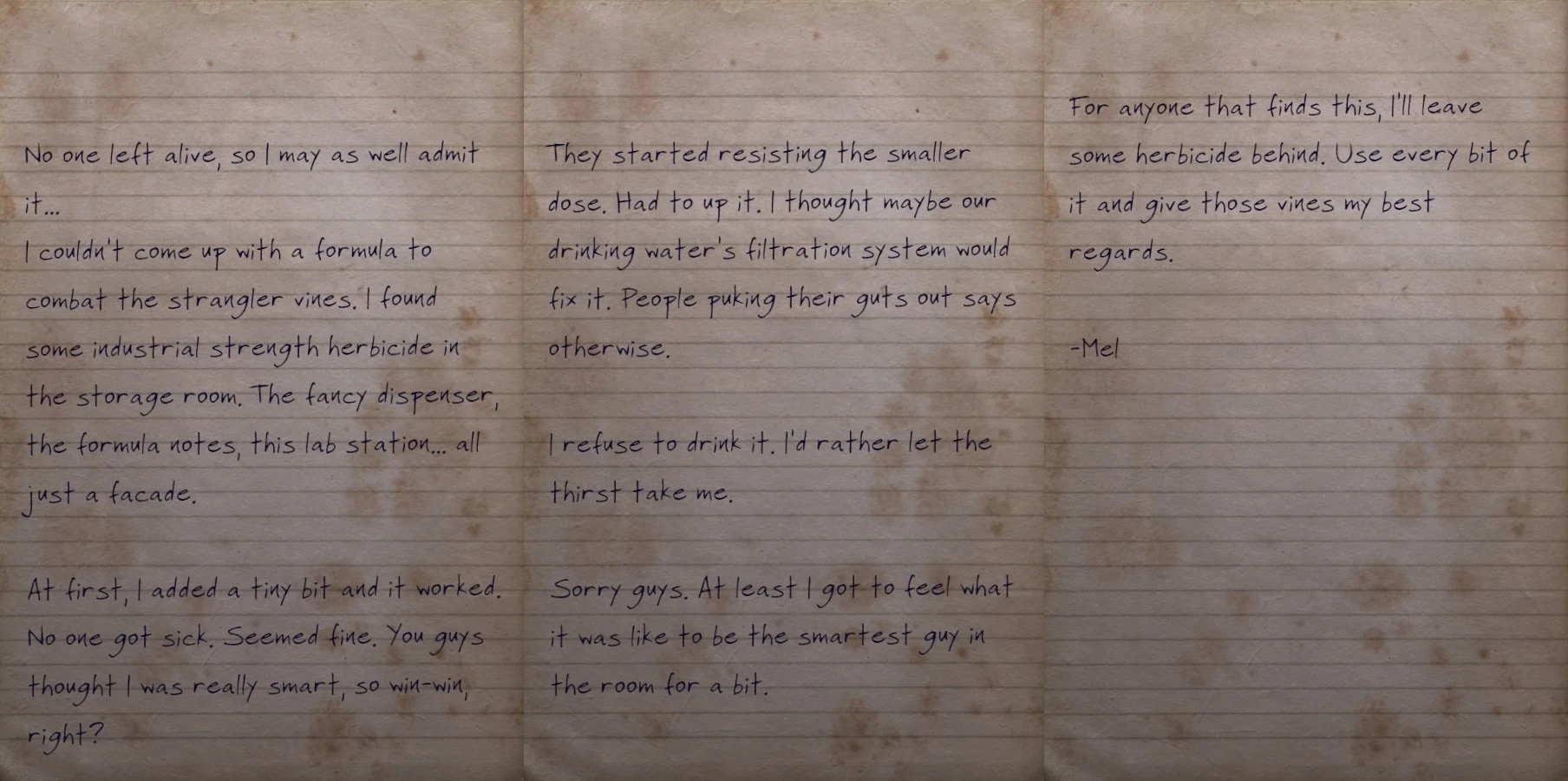 I couldn't come up with a formula to combat the strangler vines. I found some industrial strength herbicide in the storage room. The fancy dispenser, the formula notes, this lab station... all just a facade.