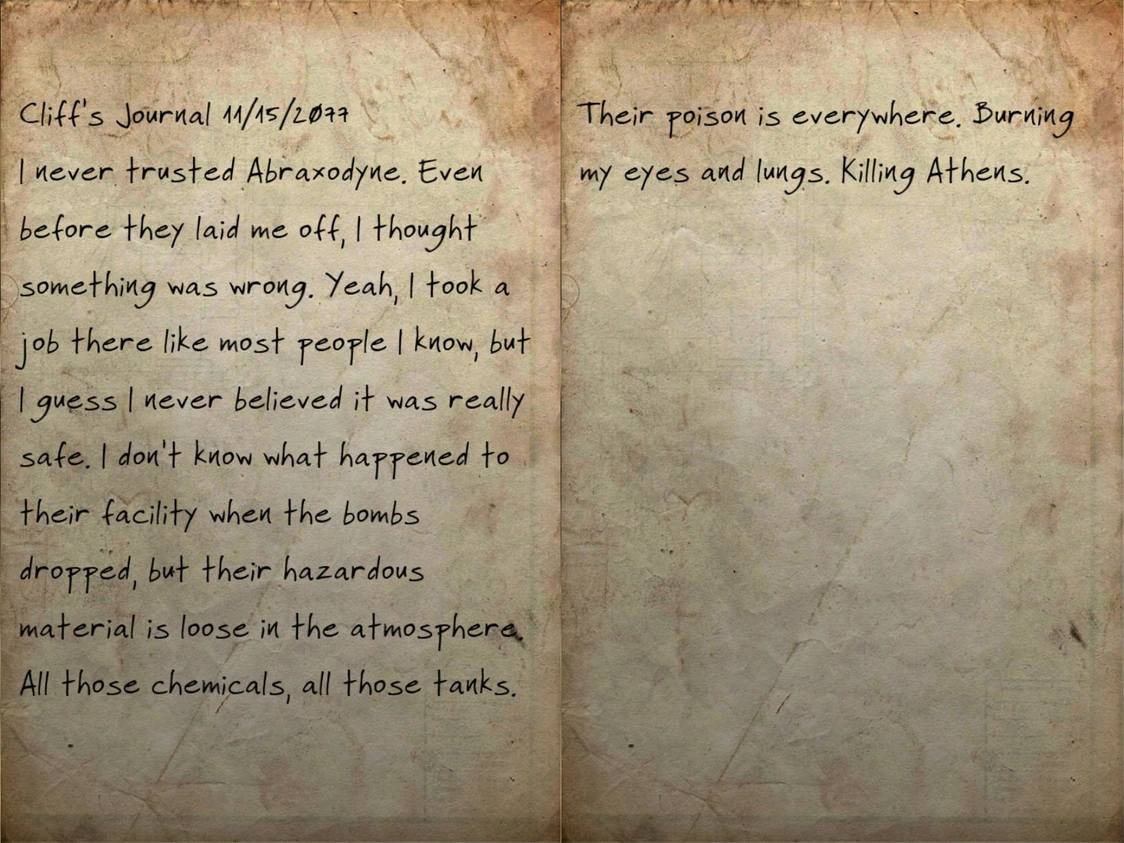 I never trusted Abraxodyne. Even before they laid me off, I thought something was wrong. Yeah, I took a job there like most people I know, but I guess I never believed it was really safe. I don't know what happened to their facility when the bombs dropped, but their hazardous material is loose in the atmosphere. All those chemicals, all those tanks.