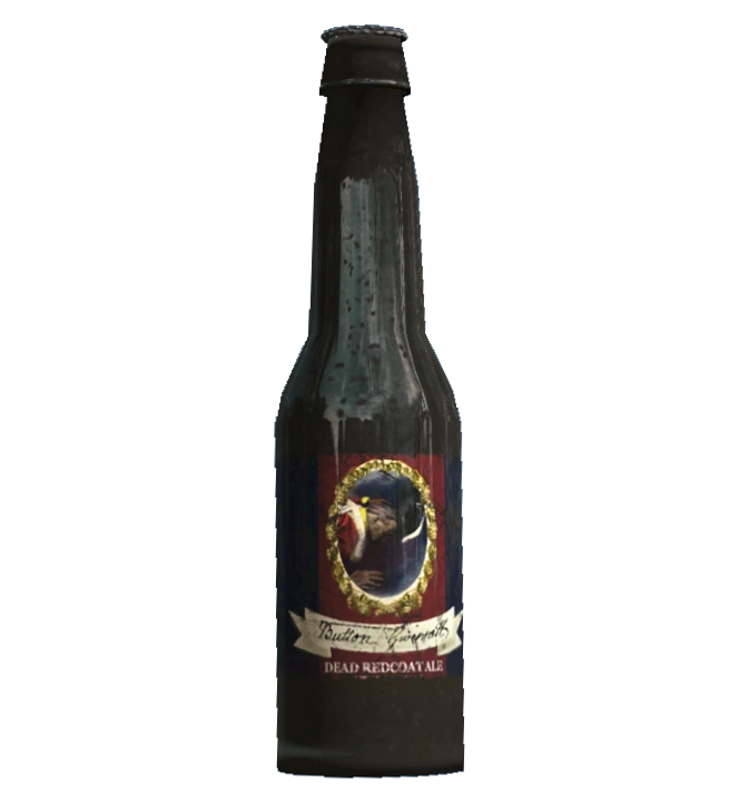 The beer is visually identical to the Gwinnett ale . It displays a wreathed image of a dead Redcoat above the text "Button Gwinnett" on a stylized scroll, which is above the text "Dead Redcoat Ale."