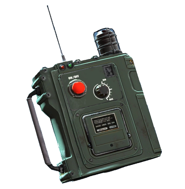 The inactive distress pulser is a portable distress beacon, which emits a homing signal. It is olive green in color with has a single red button and antenna in the top left quadrant.