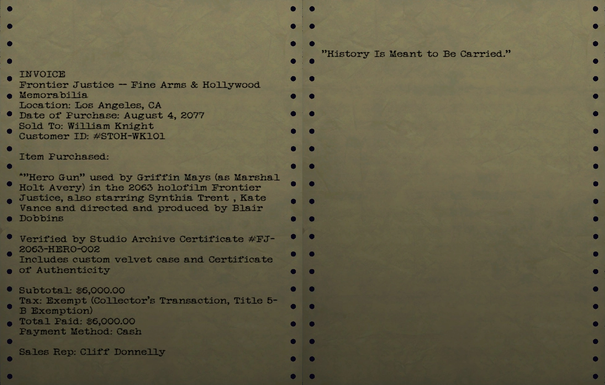 *"Hero Gun" used by Griffin Mays (as Marshal Holt Avery) in the 2063 holofilm Frontier Justice, also starring Synthia Trent, Kate Vance and directed and produced by Blair Dobbins