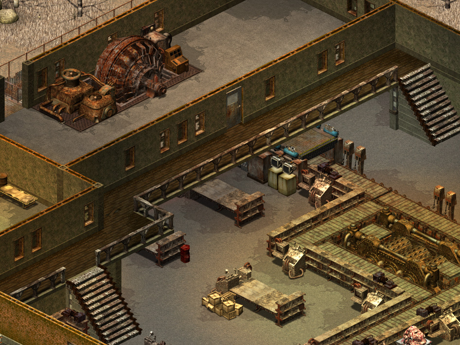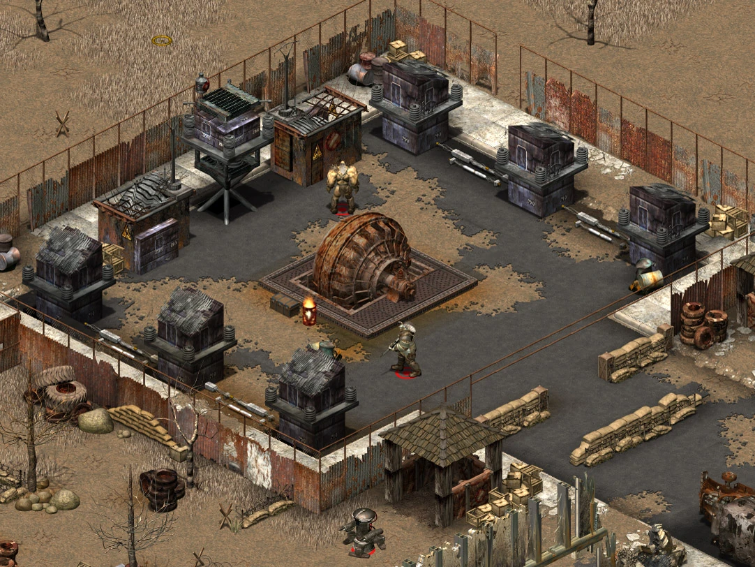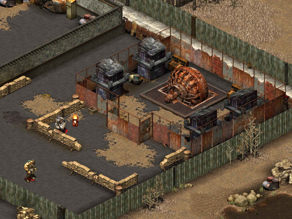 - After destroying the third generator, as the doors to the factory open, the party can go through a door right to the edge of the map, around the factory building. There are five friendly super mutants, four armed with M2s and 120 ammo each. They can either be killed (they don't return fire) for the guns and ammo and big drop in Karma, or just steal 30 ammo from each for no Karma drop.