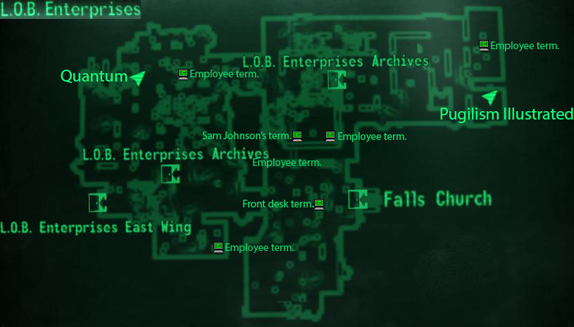 - While L.O.B. Enterprises does not show up on the Pip-Boy "world map," its entrance is marked on the Pip-Boy "local map." Fast traveling to Falls Church East places one right outside the building.