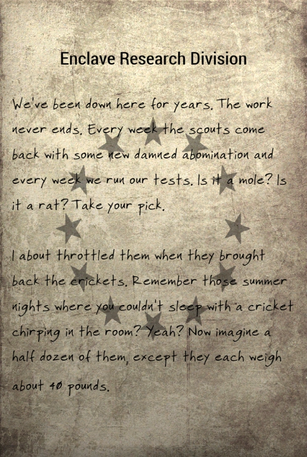 We've been down here for years. The work never ends. Every week the scouts come back with some new damned abomination and every week we run our tests. Is it a mole? Is it a rat? Take your pick.