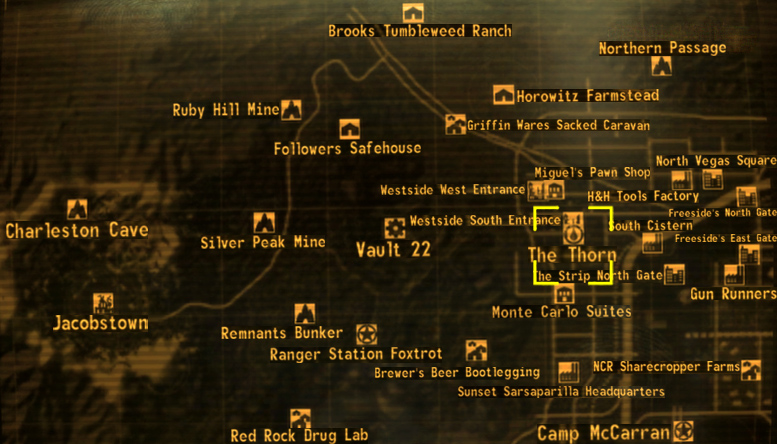 Several large makeshift barricades and sniper towers dot the western perimeter. The courtyard of the complex is utilized as a garden, with rows of planters filling a paved area directly to the south. The plants can not be harvested by the Courier. A smaller interior makeshift fence surrounds the garden, and a mailbox can be found beyond the southern fence.