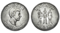 The denarius (silver), which bears an image of a younger Caesar on the obverse and Caesar, Joshua Graham and Bill Calhoun on the reverse. The inscriptions are in Latin, "Caesar Dictator" meaning "Dictator Caesar" or "Absolute Ruler Caesar" on the front and "Magnum Chasma" meaning "Great Abyss," "Great Chasm" or "Great Fissure" on the back, referring to the Grand Canyon. The symbolism is simple; the denarius commemorates young Caesar's journey to the Grand Canyon and his first victories as a dictator of the Grand Canyon tribes.